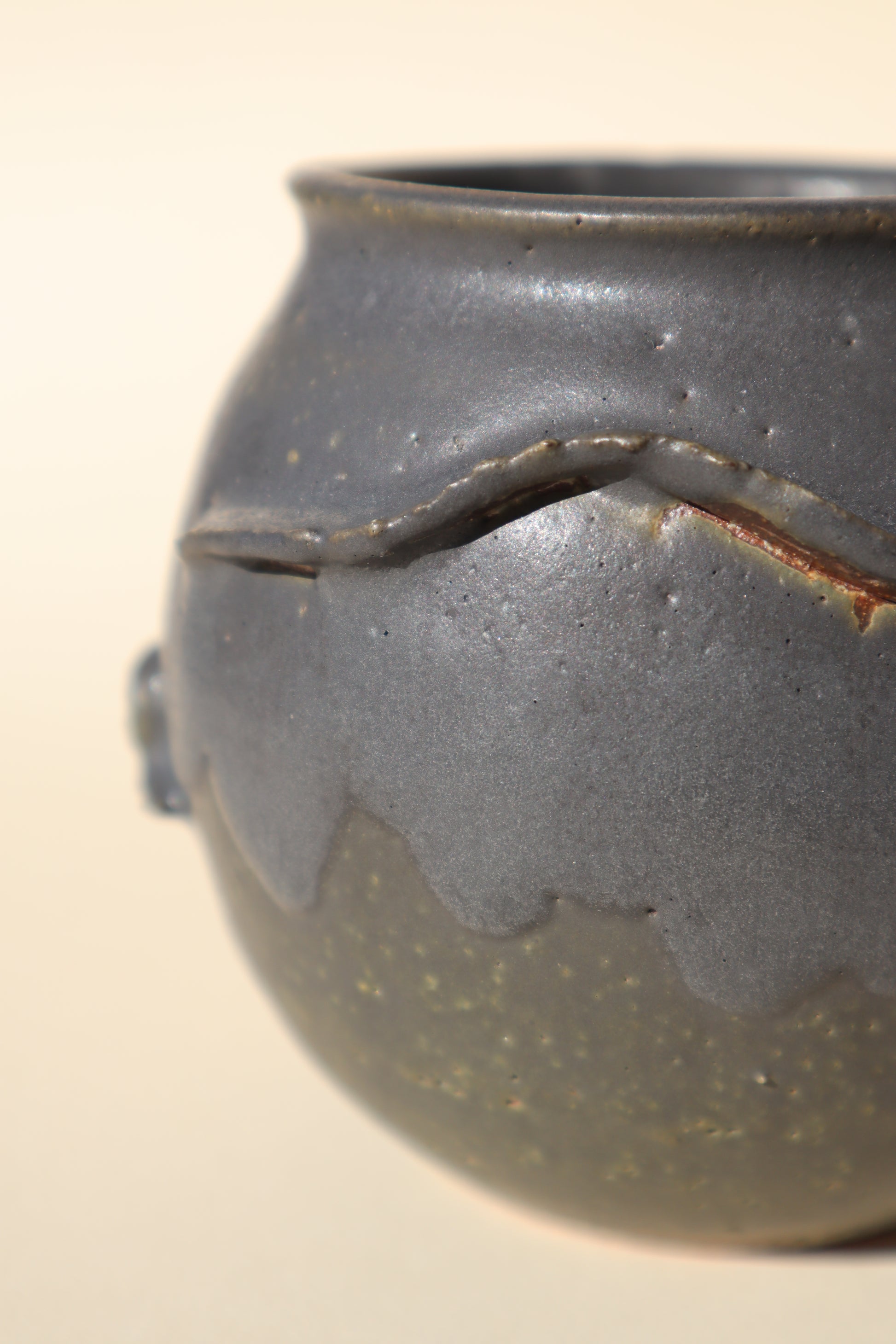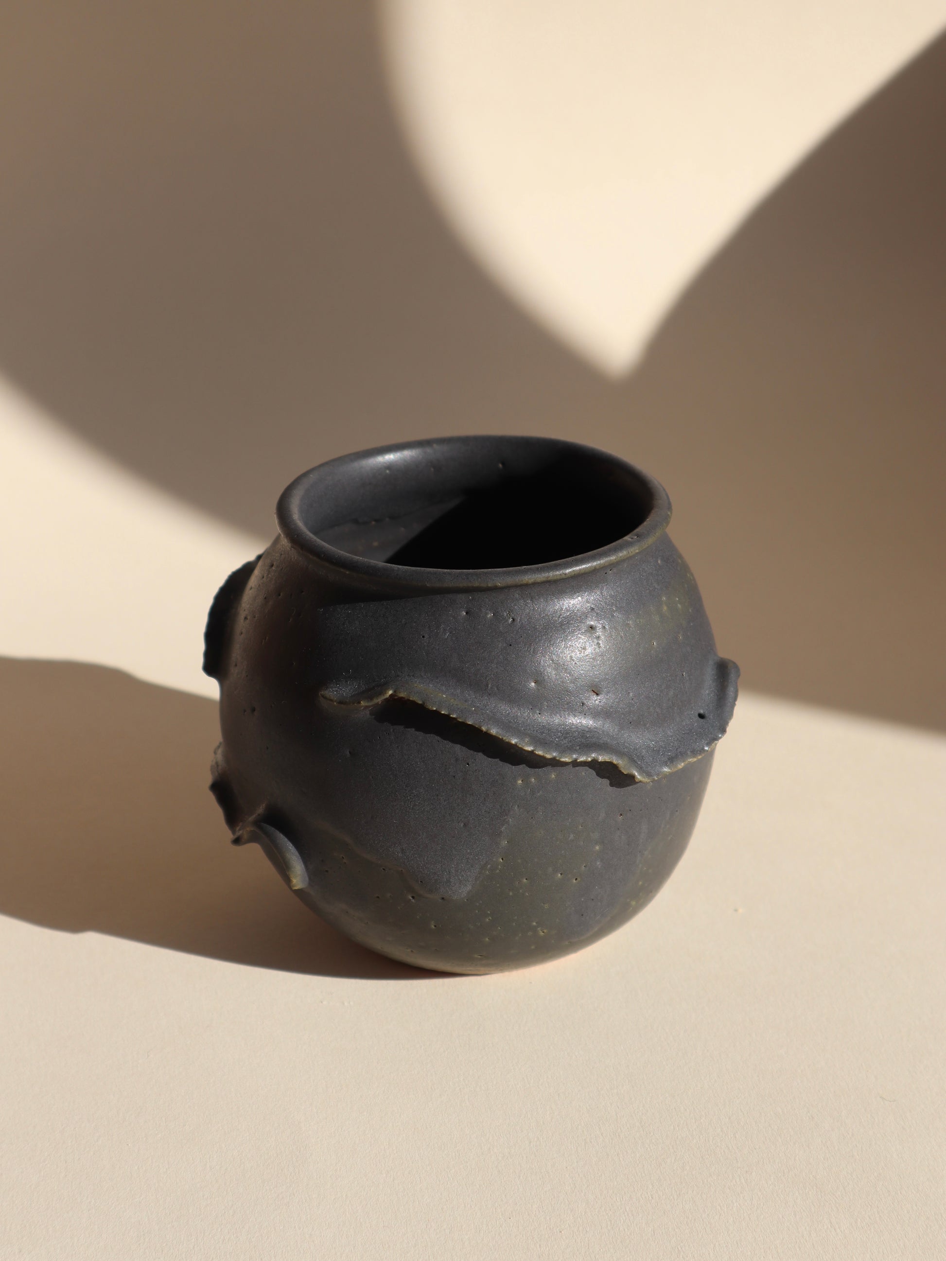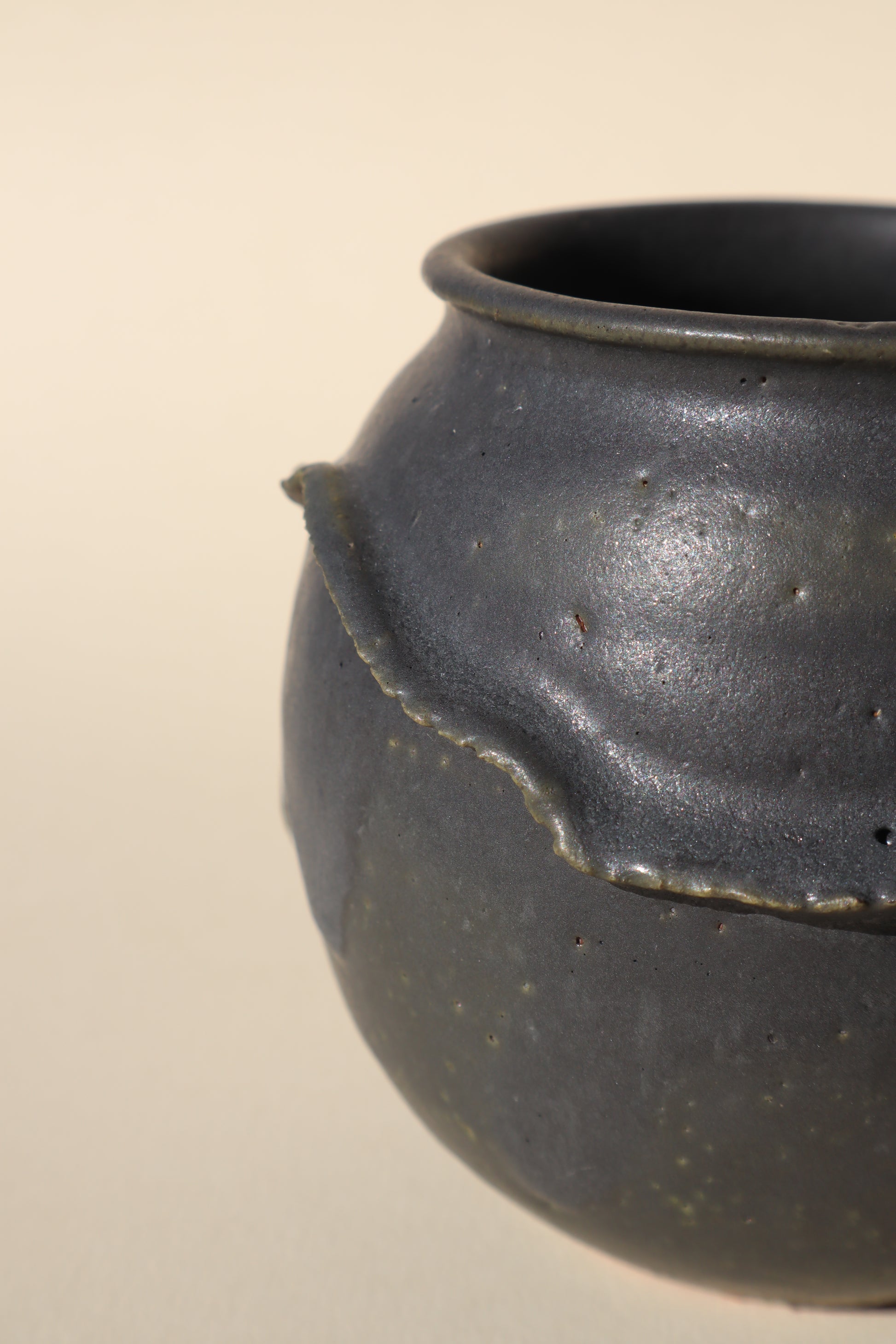 Wheel thrown stoneware clay vessel with a Charcoal glaze blending to a dark olive green around the base.