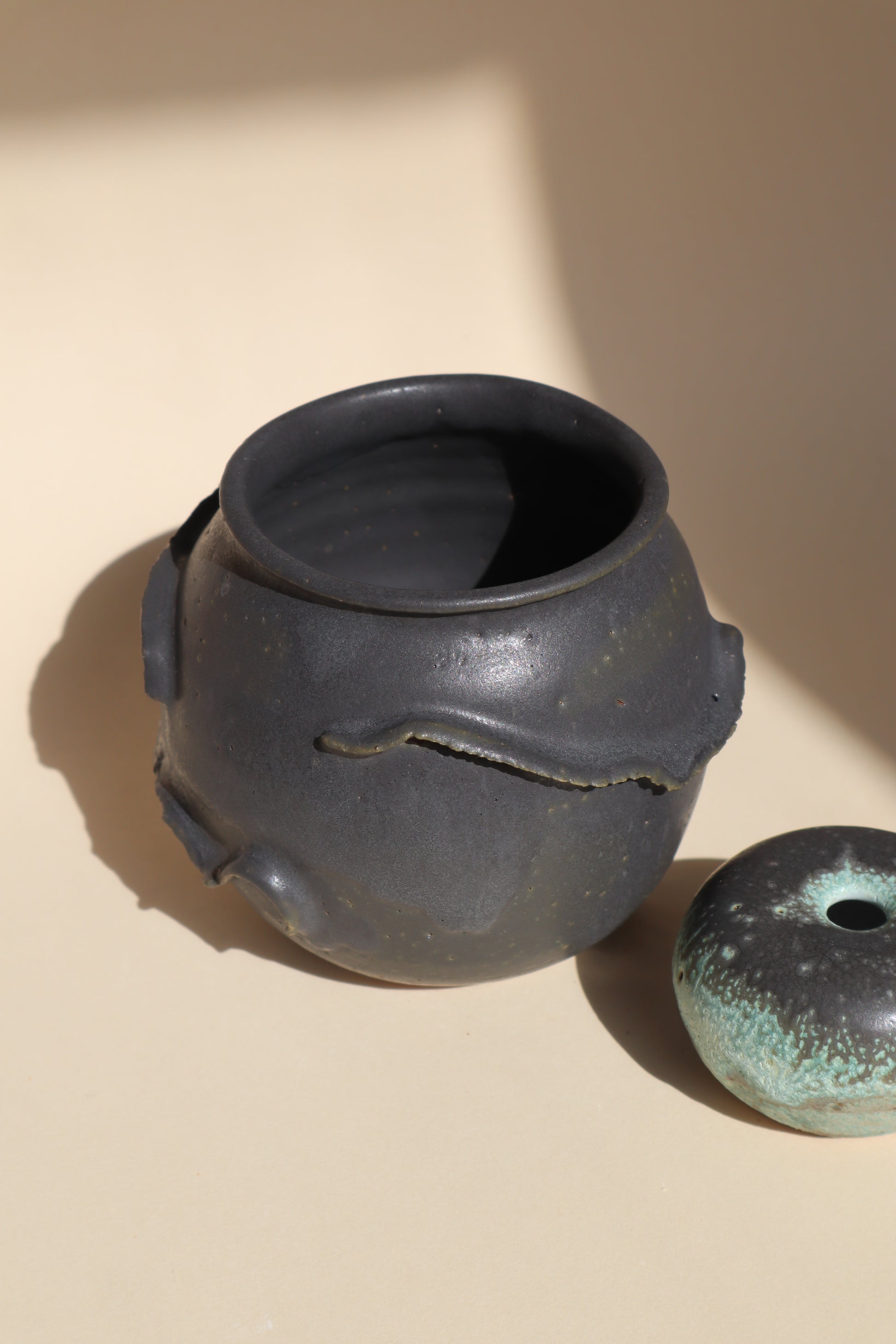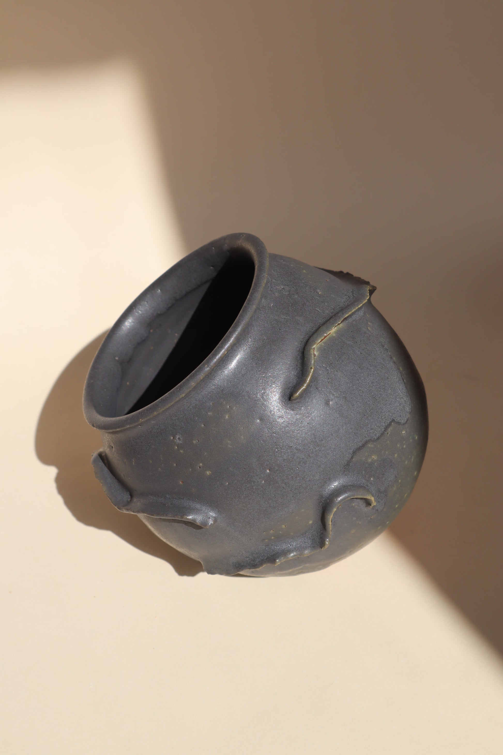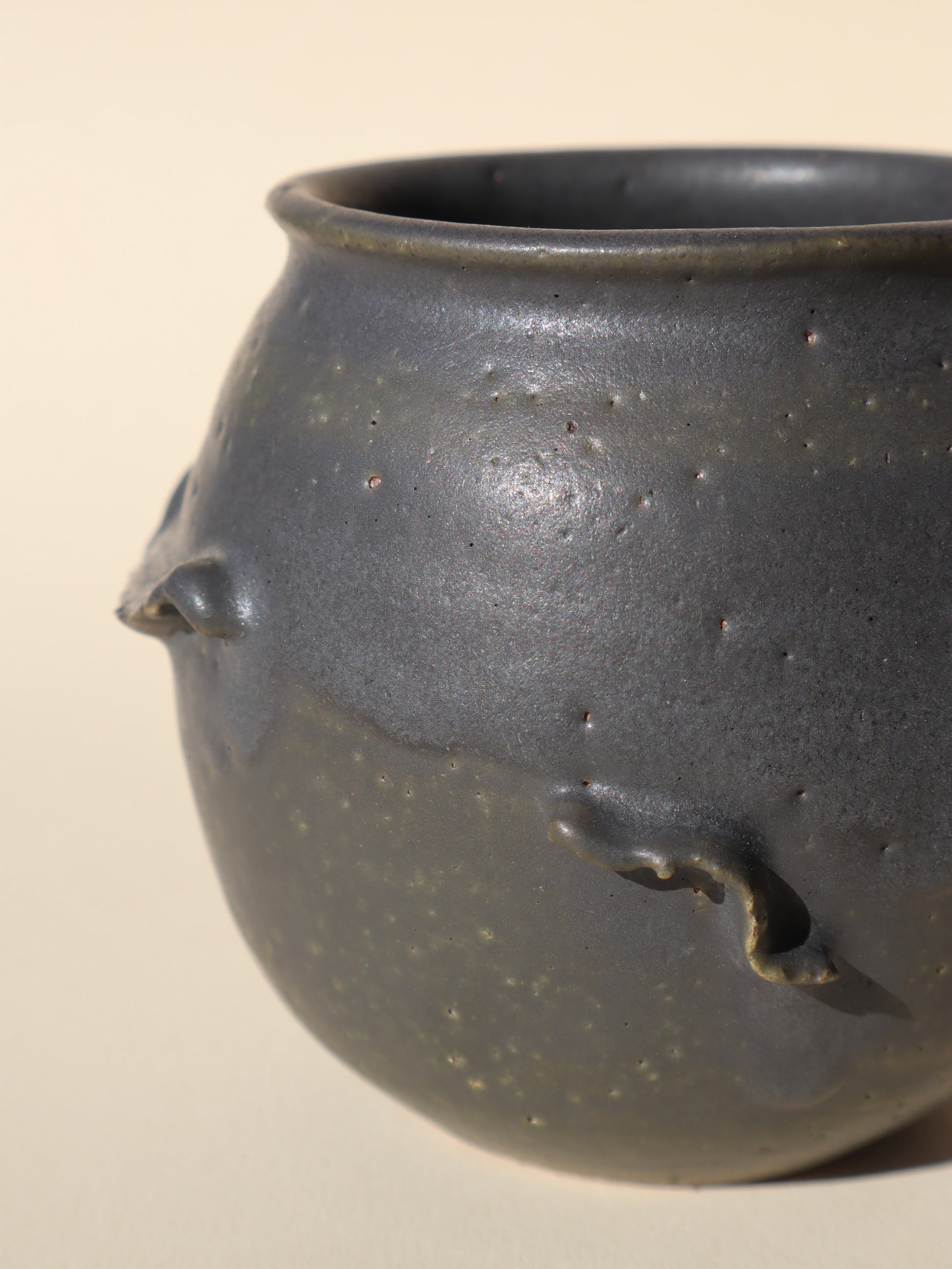 Wheel thrown stoneware clay vessel with a Charcoal glaze blending to a dark olive green around the base.