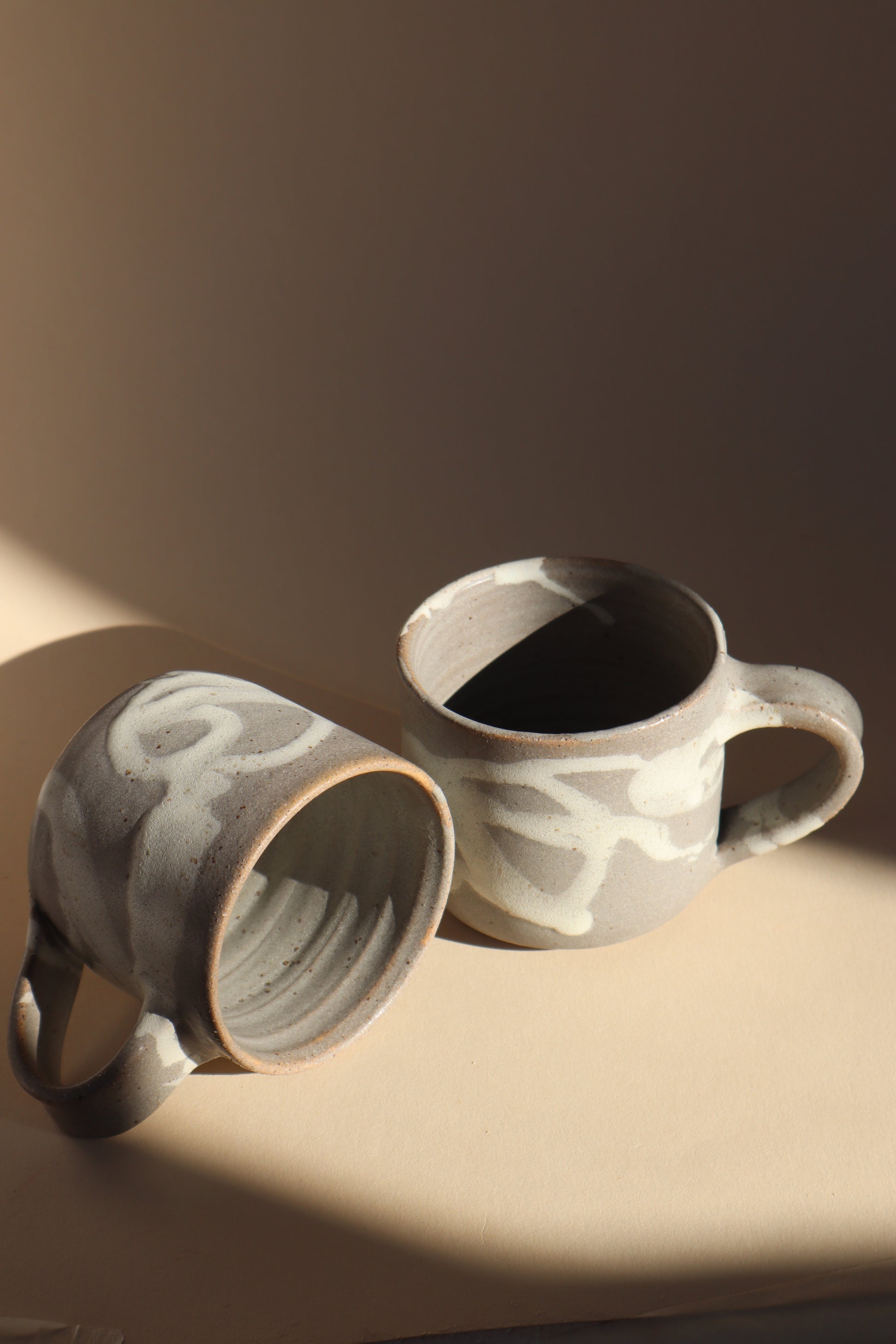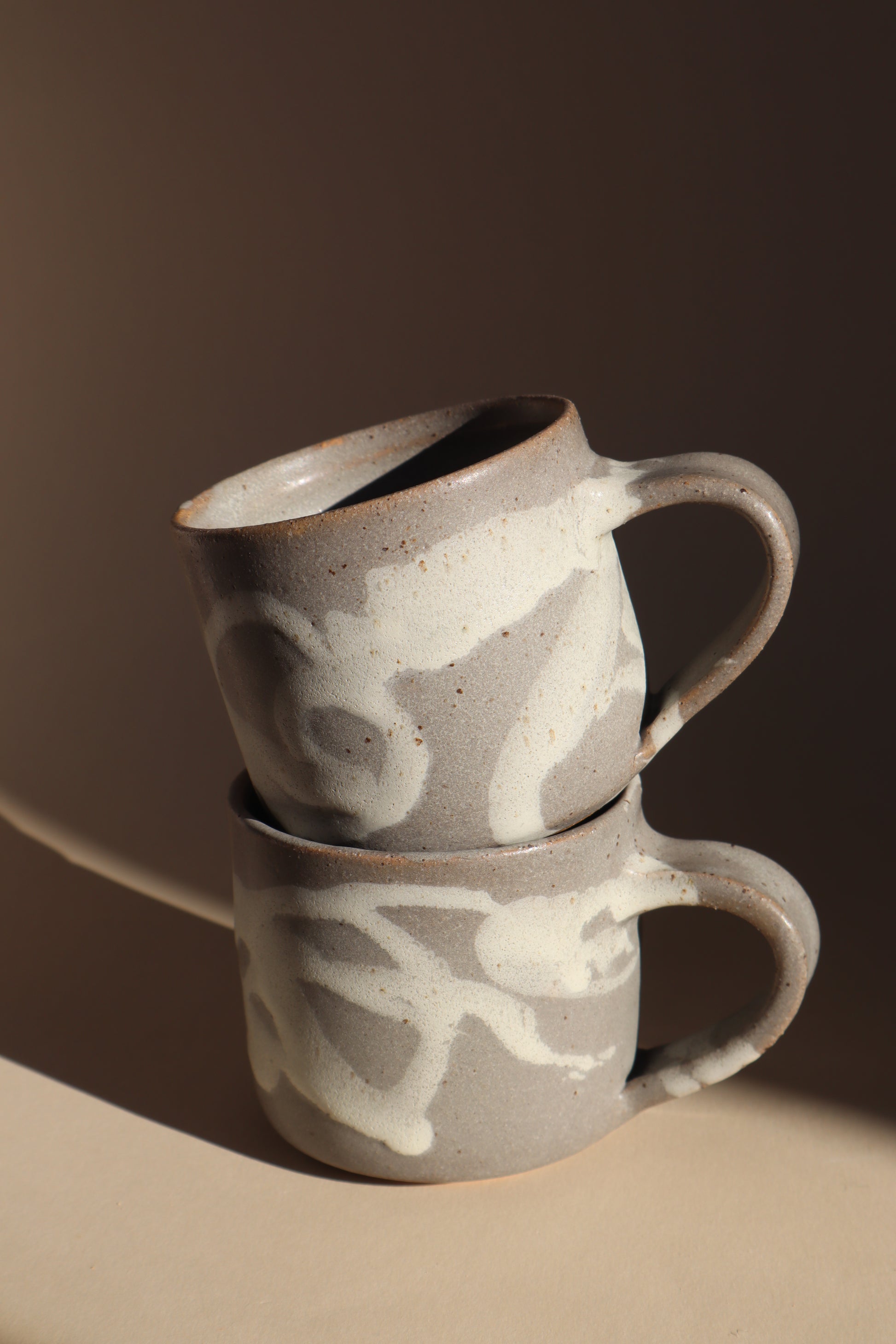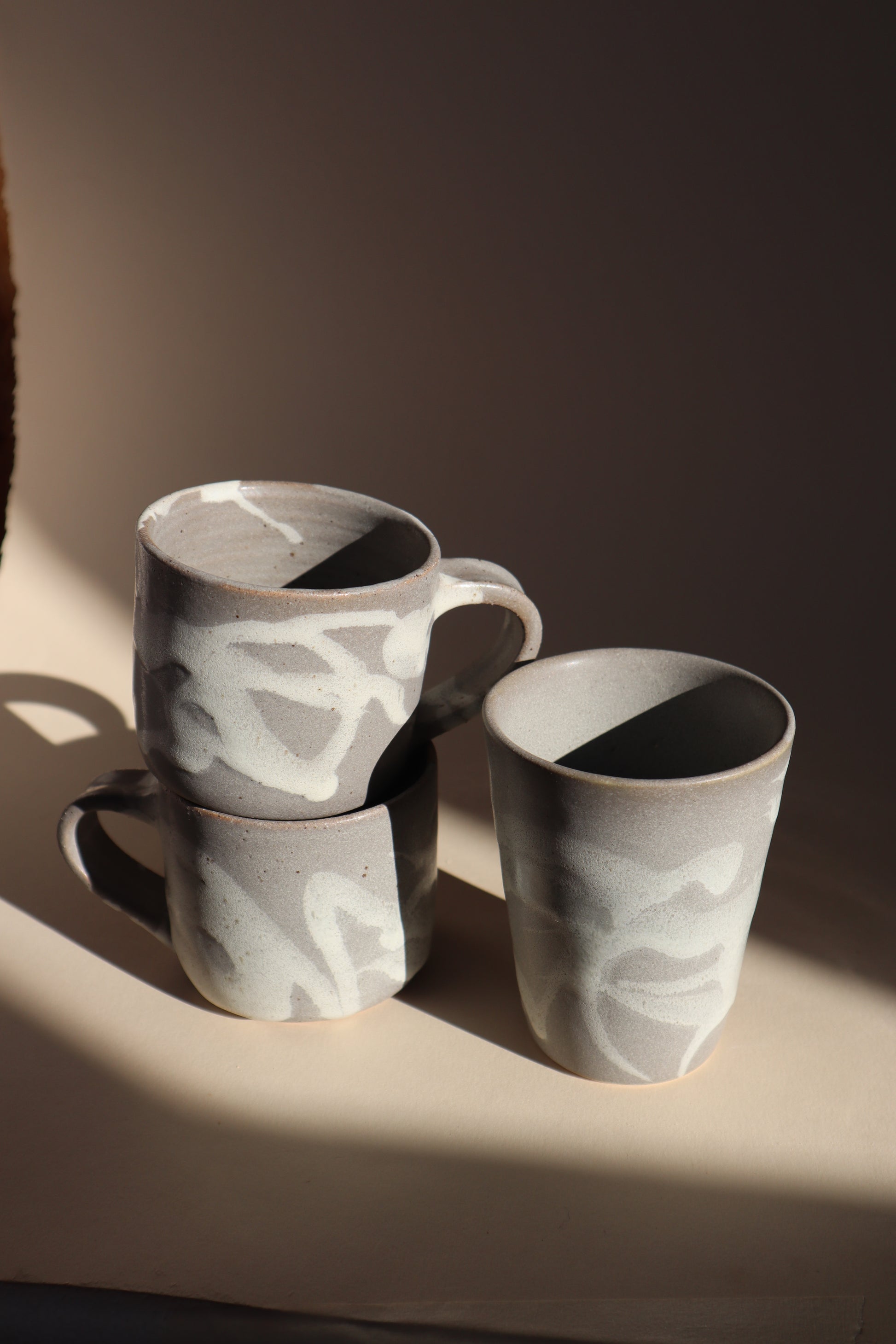 A small batch of wheel thrown stoneware clay mugs glazed with a pale grey smooth satin glaze marked with splashes of white.