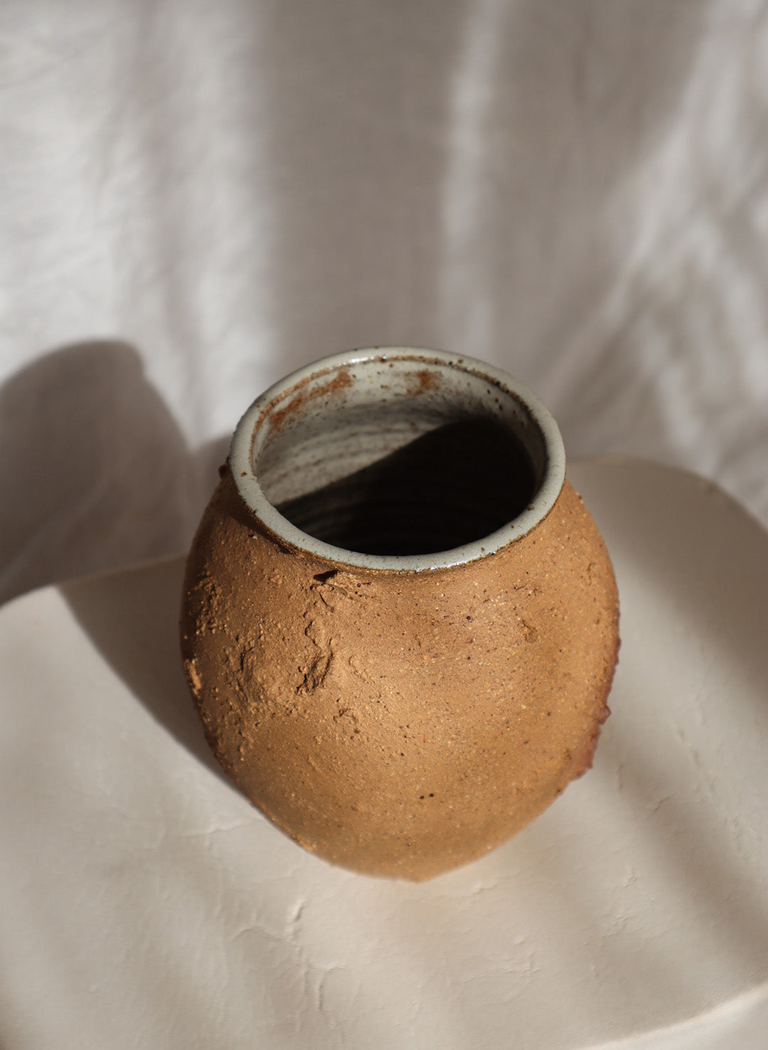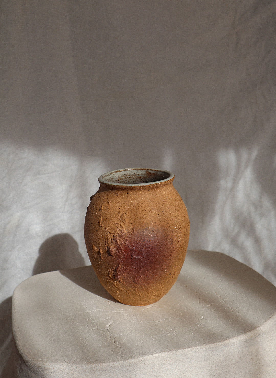 A hand thrown textured raku vase, it's surface gently marked with a red heart-like flash. Glazed inside with a pale grey satin watertight glaze.
