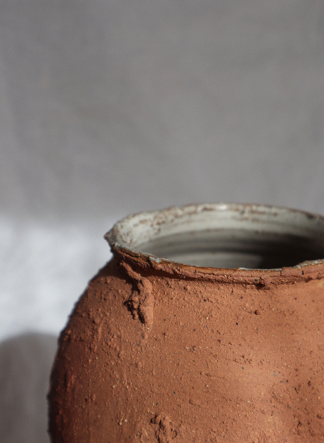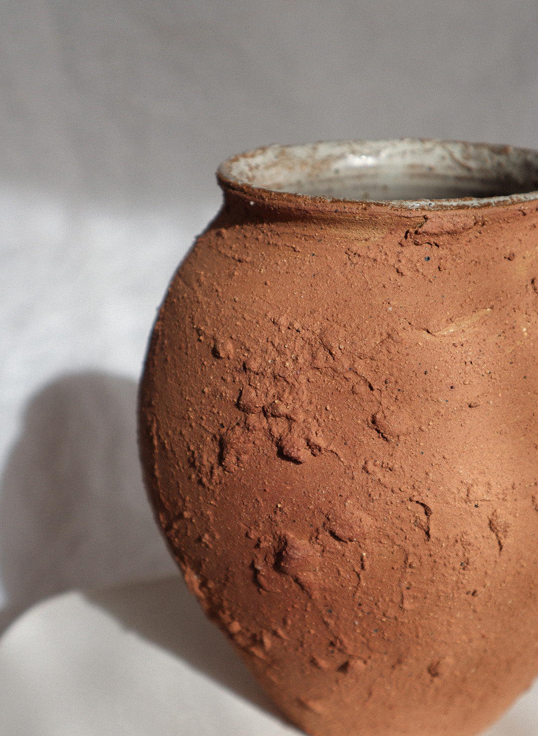 A hand thrown raku clay vase with additional texture, marked with flashes of warmer tones. Glazed inside with a pale grey smooth satin glaze.
