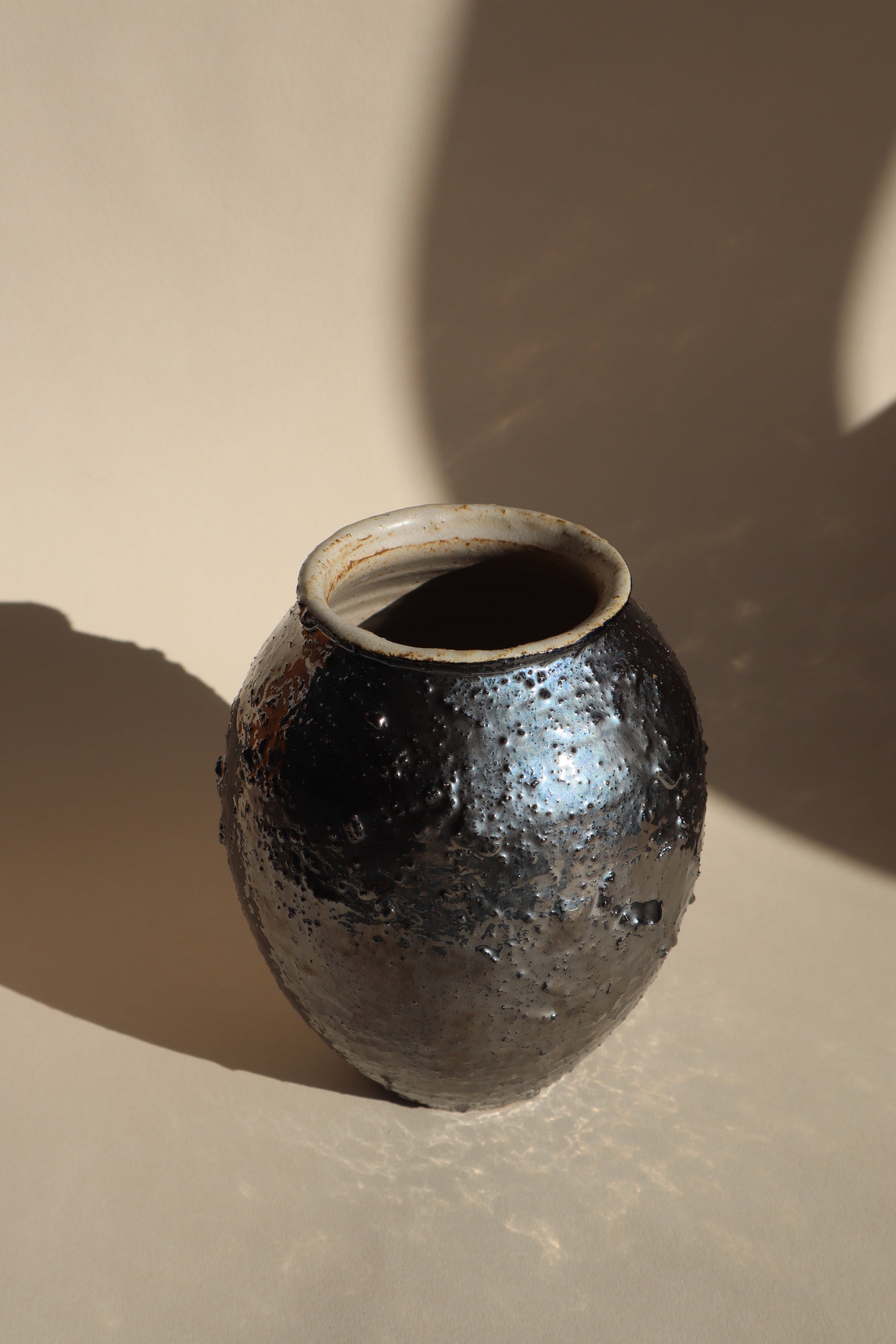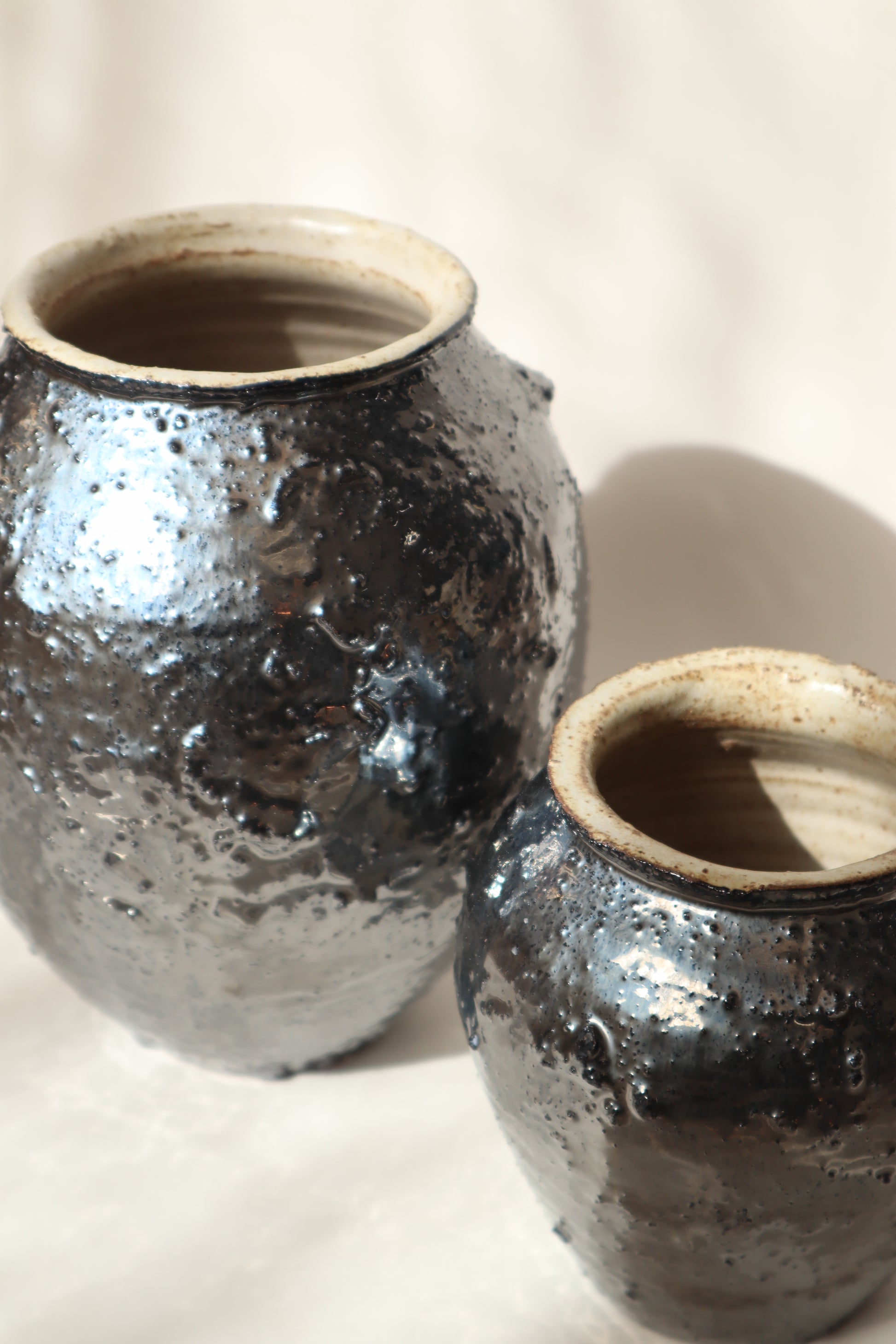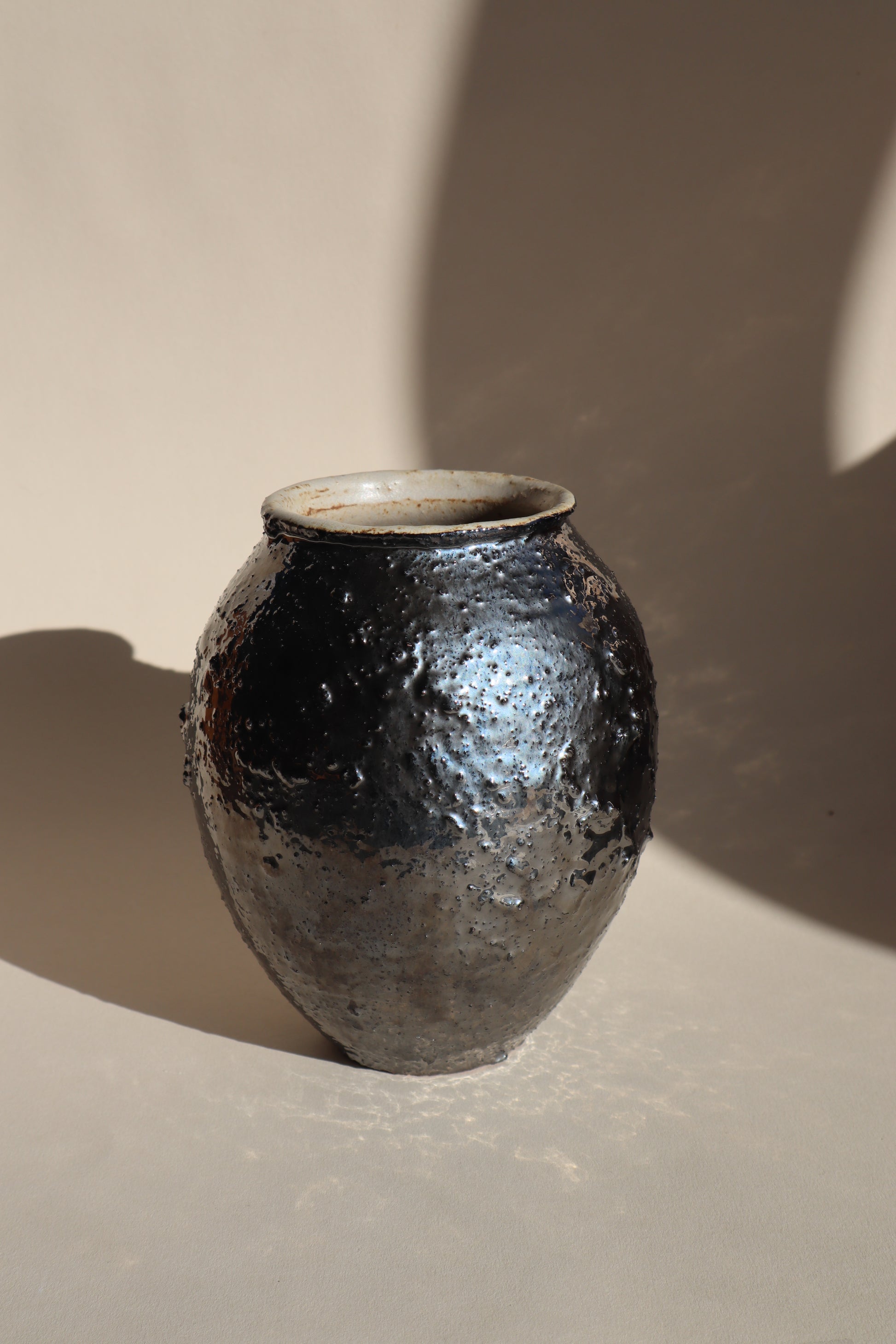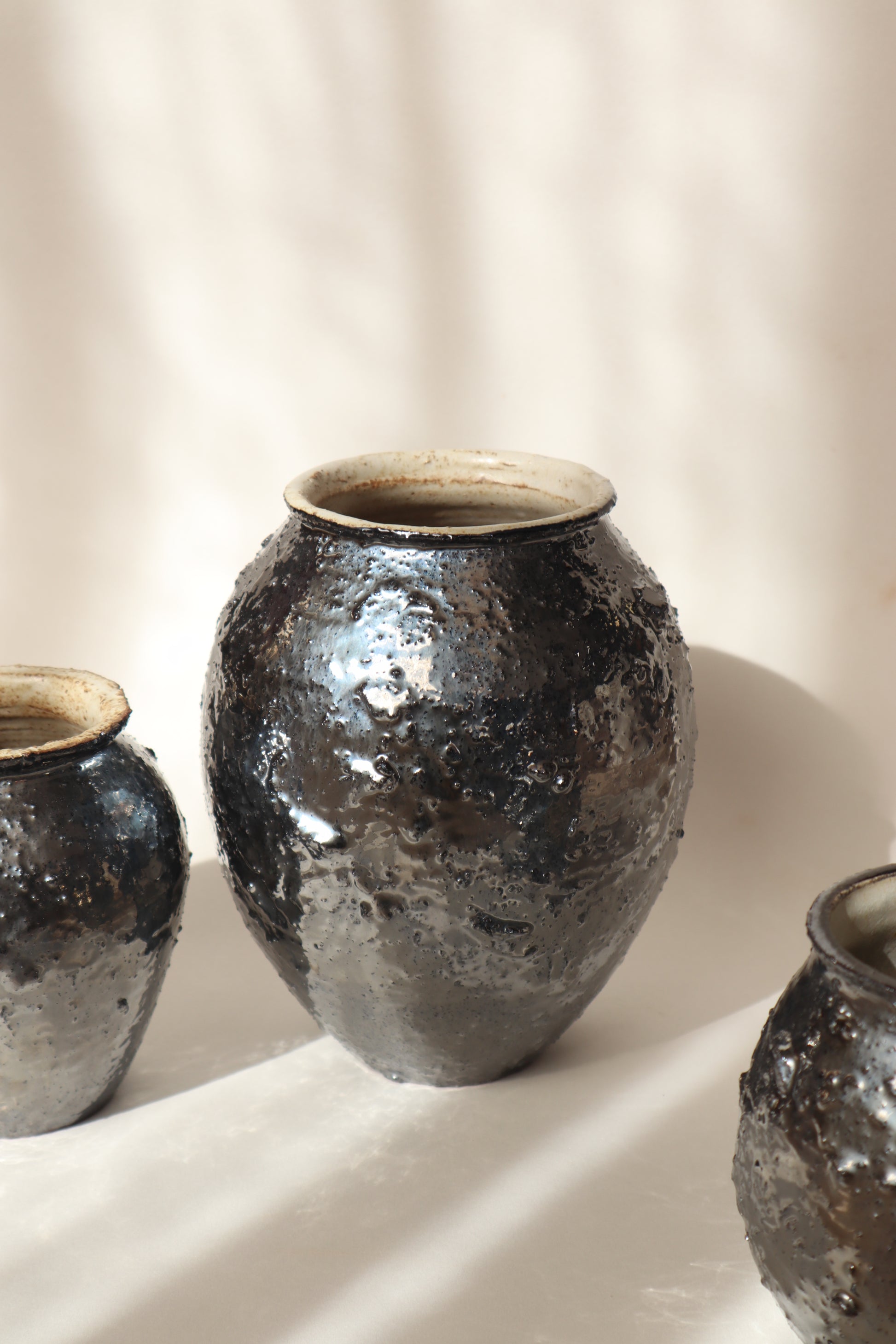 A hand thrown raku vase with additional texture and a metallic dark silver glaze. Finished with a smooth pale satin grey glaze inside.