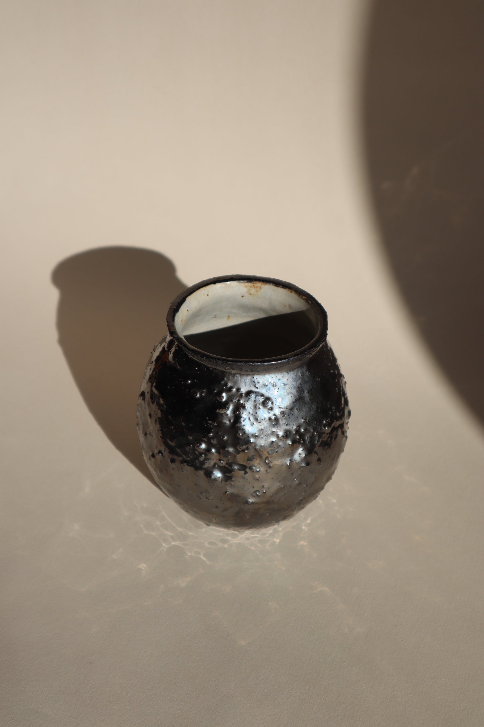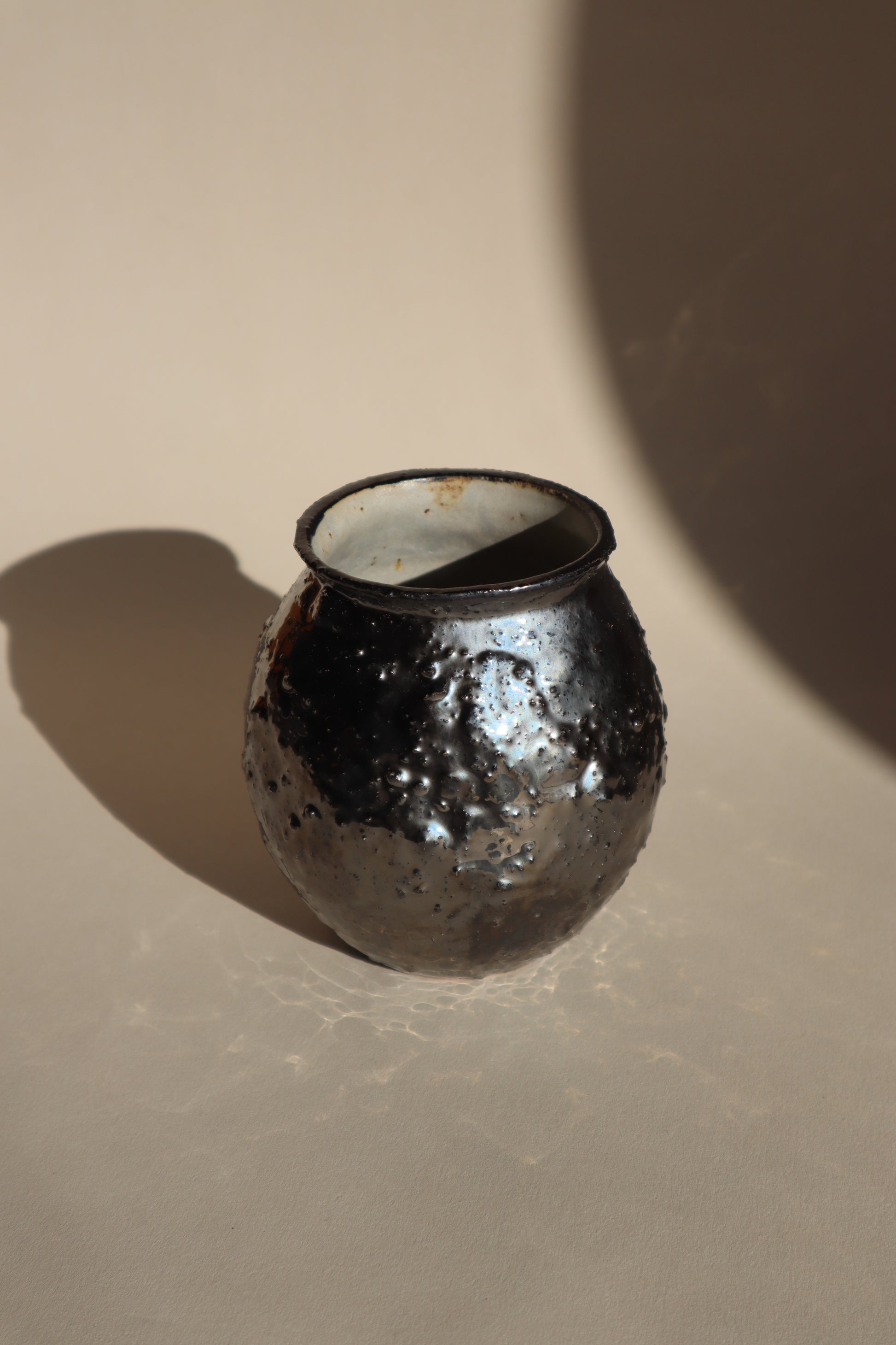 A hand thrown raku vase with additional texture and a metallic dark silver glaze. Finished with a smooth pale satin grey glaze inside.