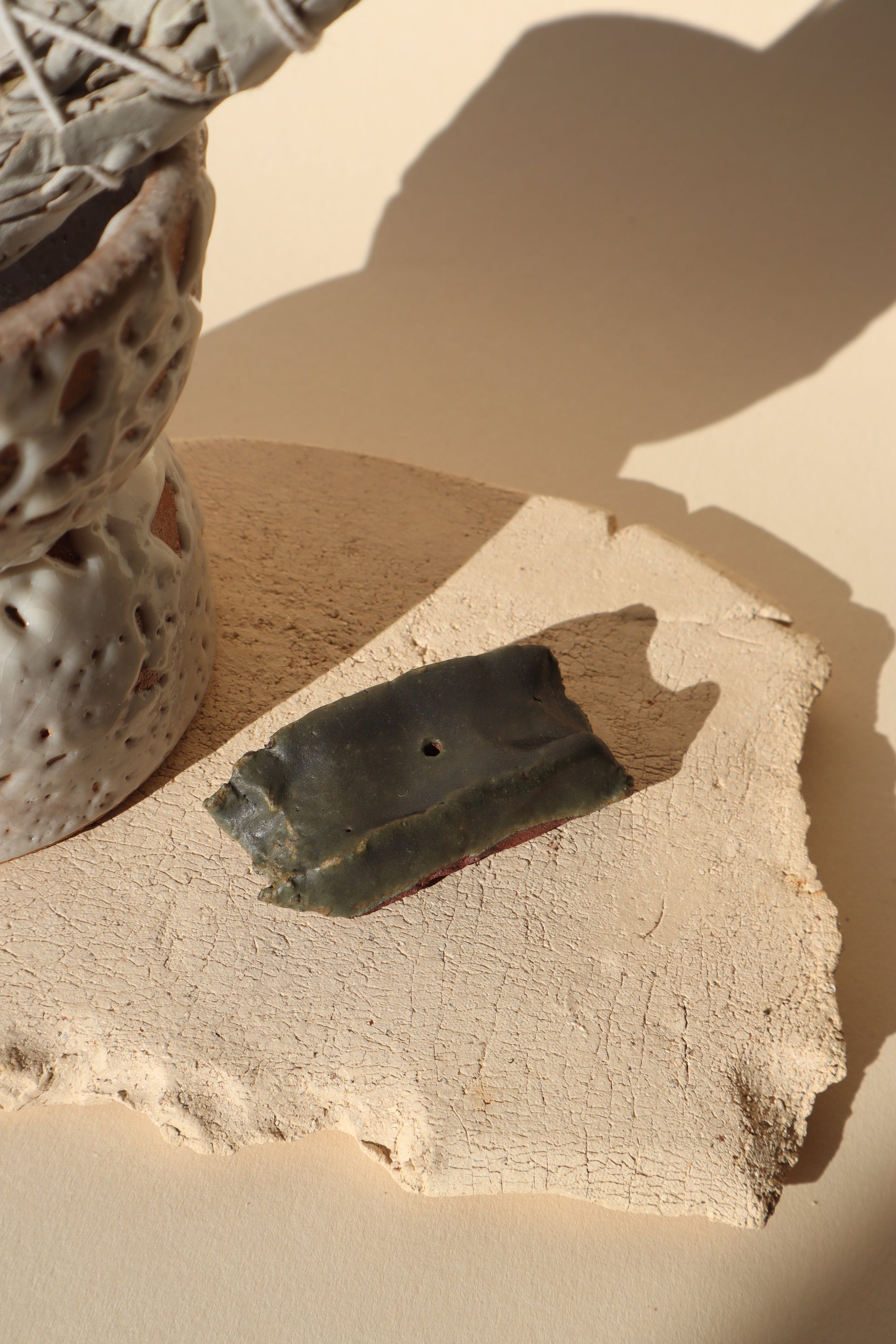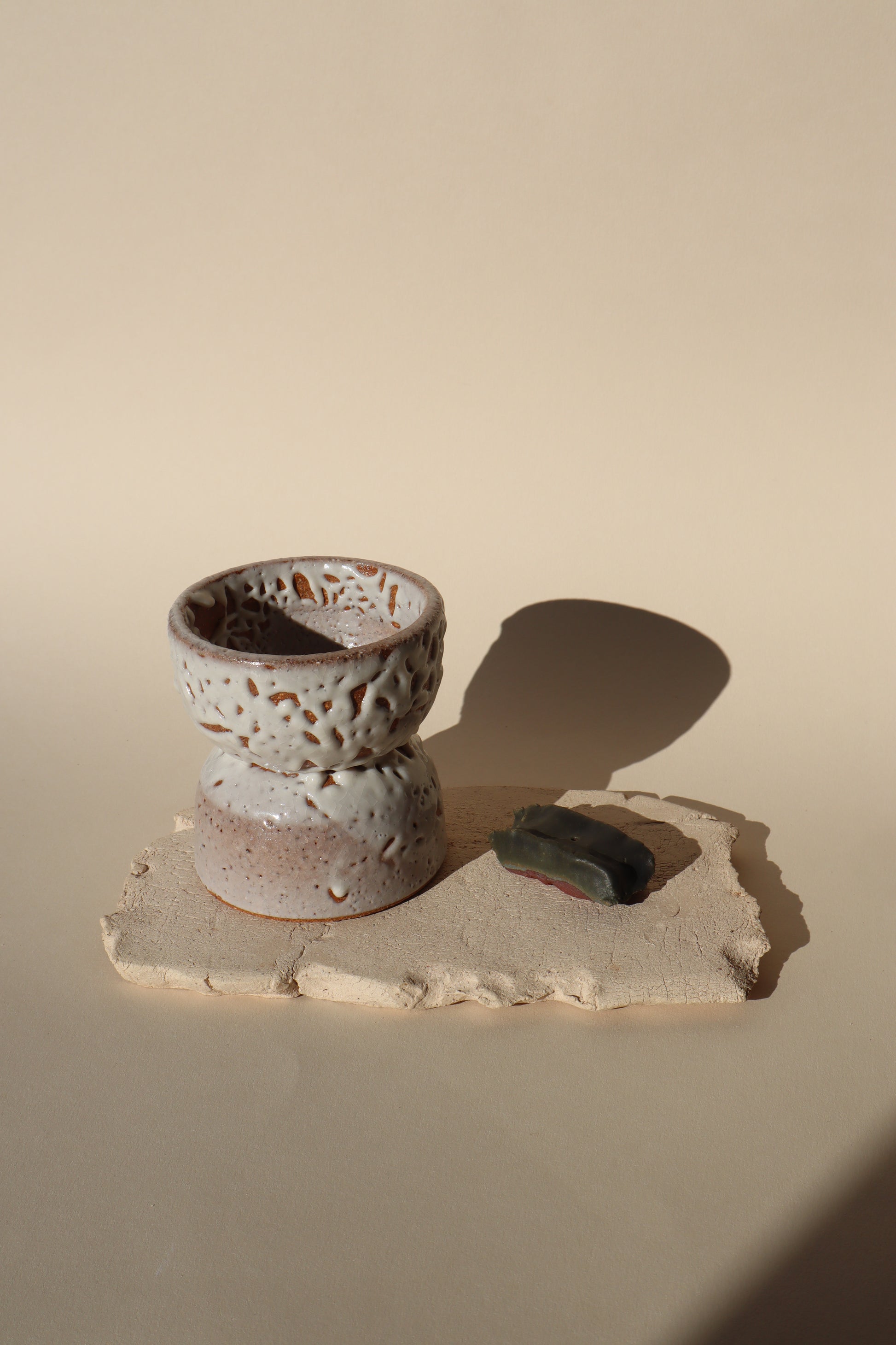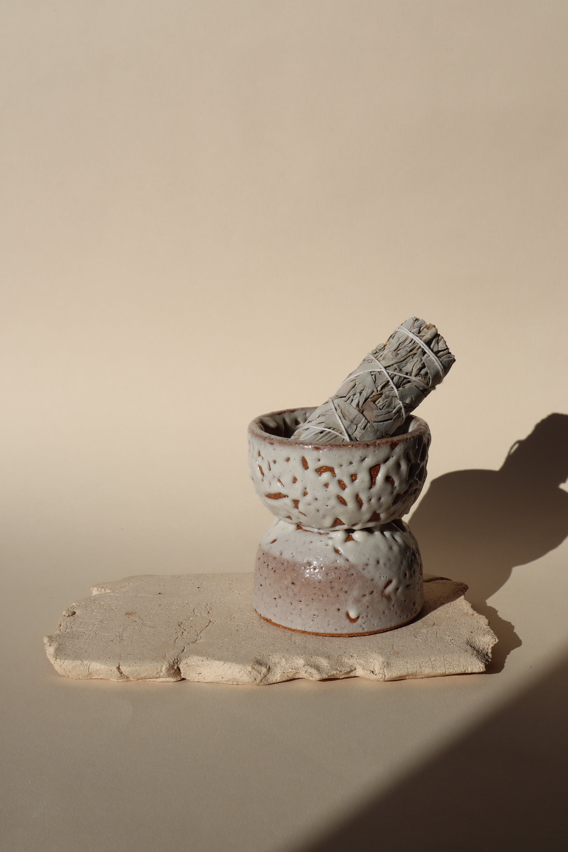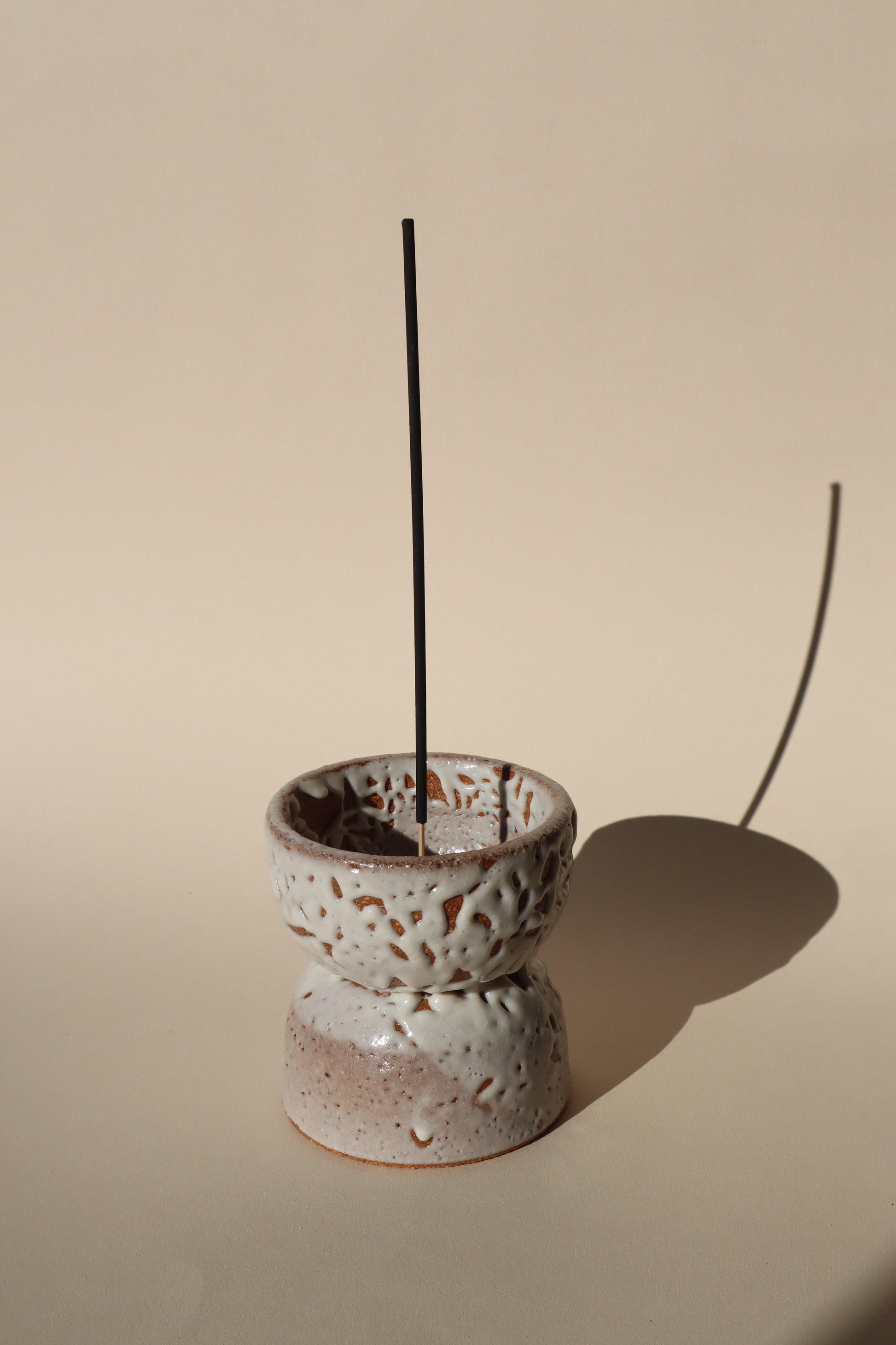 - Stoneware incense holder with crawling crackle glaze. Can be paired with a tea light candle or tapered candle (with support of small stones or sand).