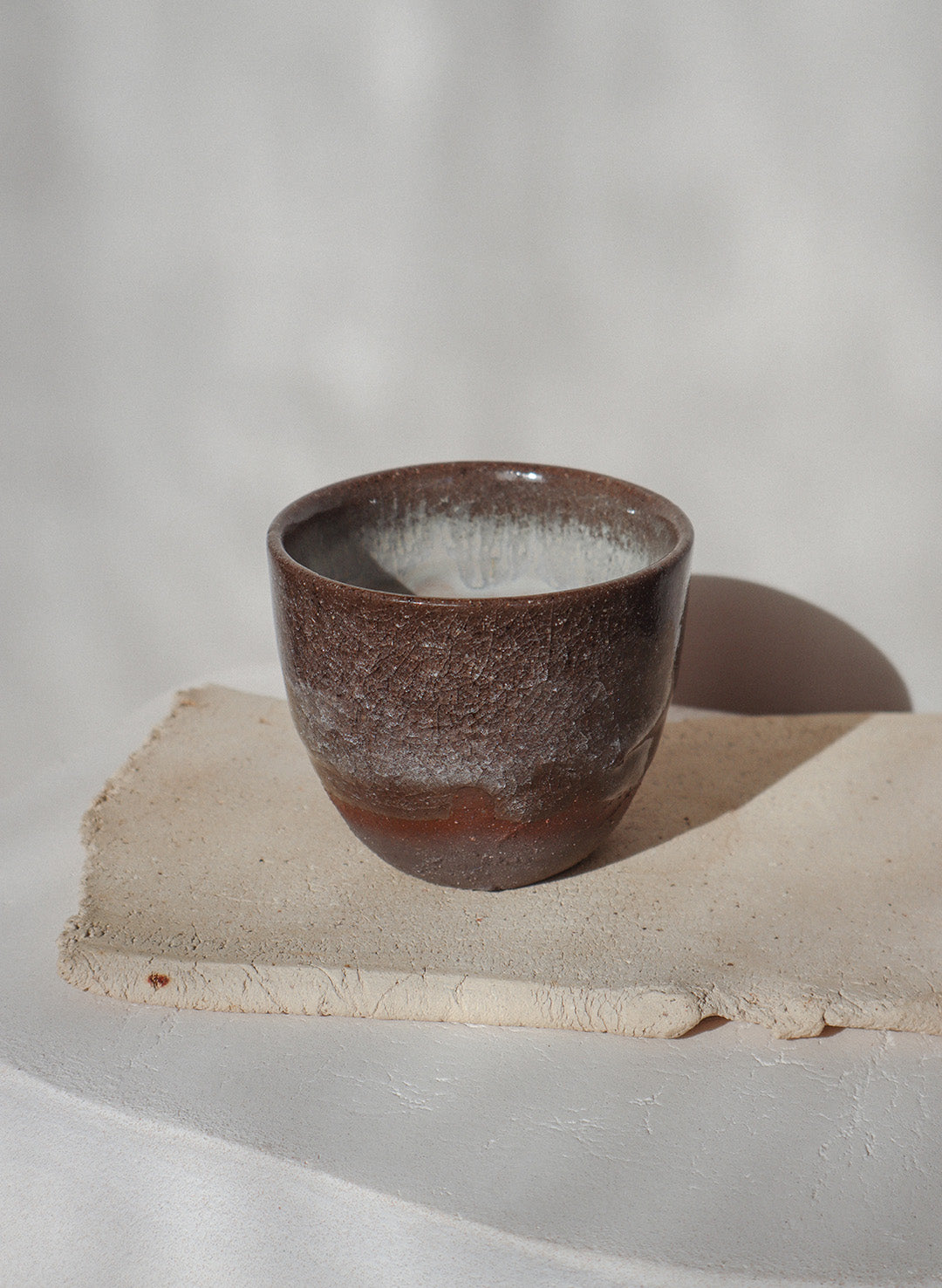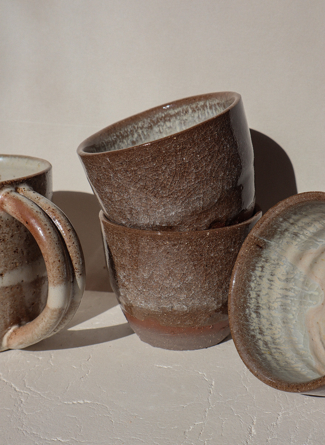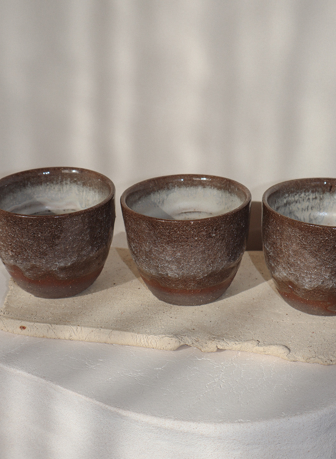 A small batch collection of hand thrown stoneware tumblers glazed with a smooth satin pale grey glaze inside and a transparent crackled glaze on the outside leaving a small section unglazed at the base of the vessel.
