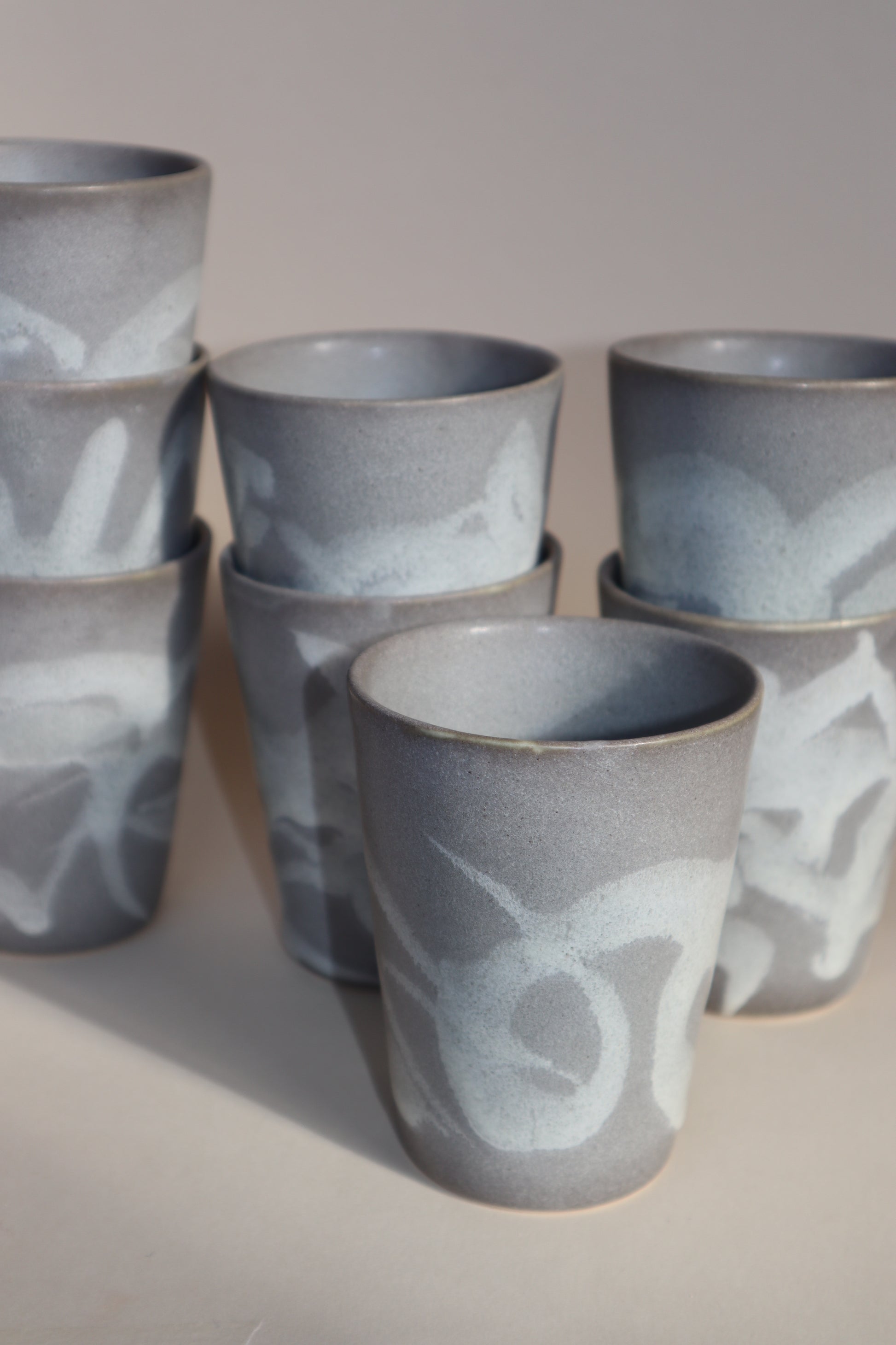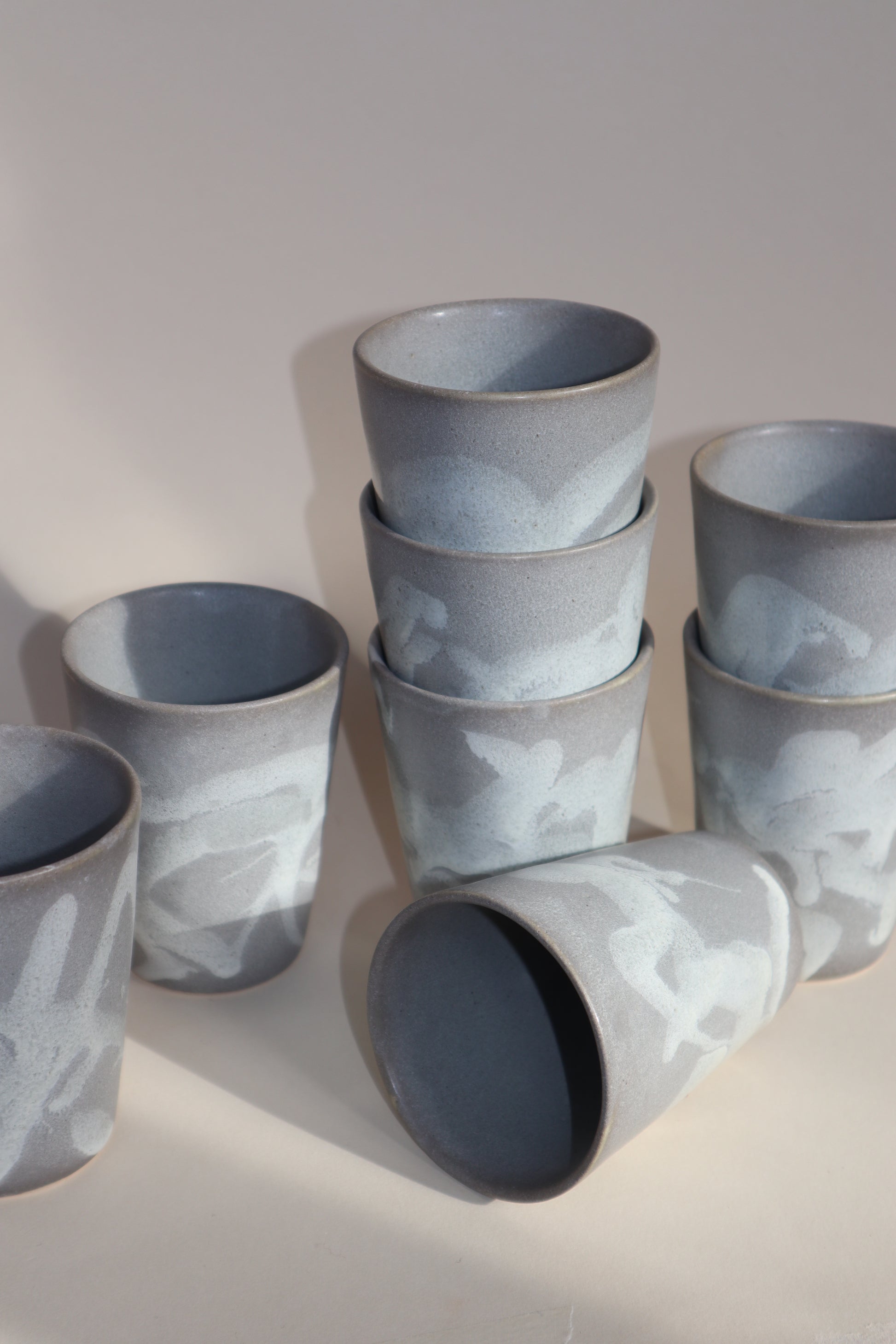 A small batch of stoneware tumblers with a smooth satin grey glaze marked with splashes of white.