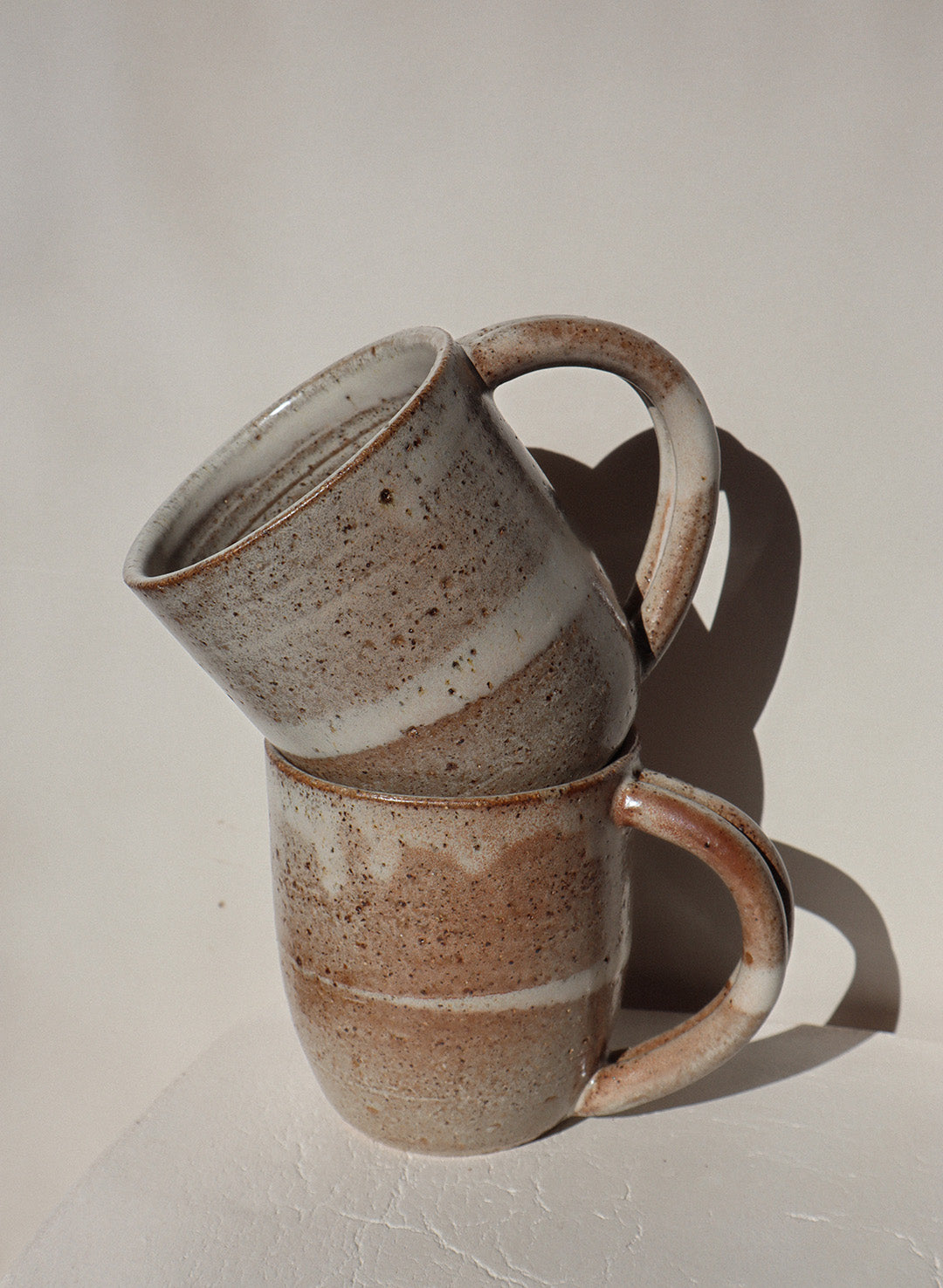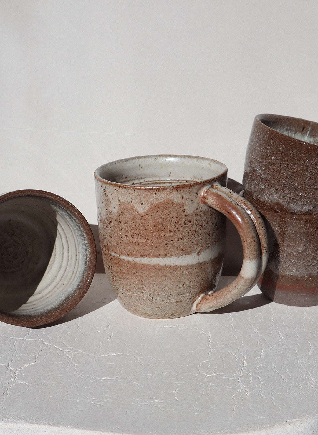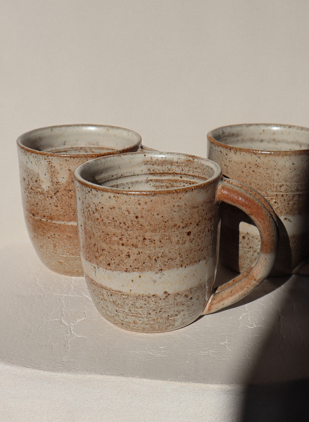 A small batch collection of mugs hand thrown with speckled raku clay glazed with a pale grey smooth satin glaze marked with soft flashes of warm brown.
